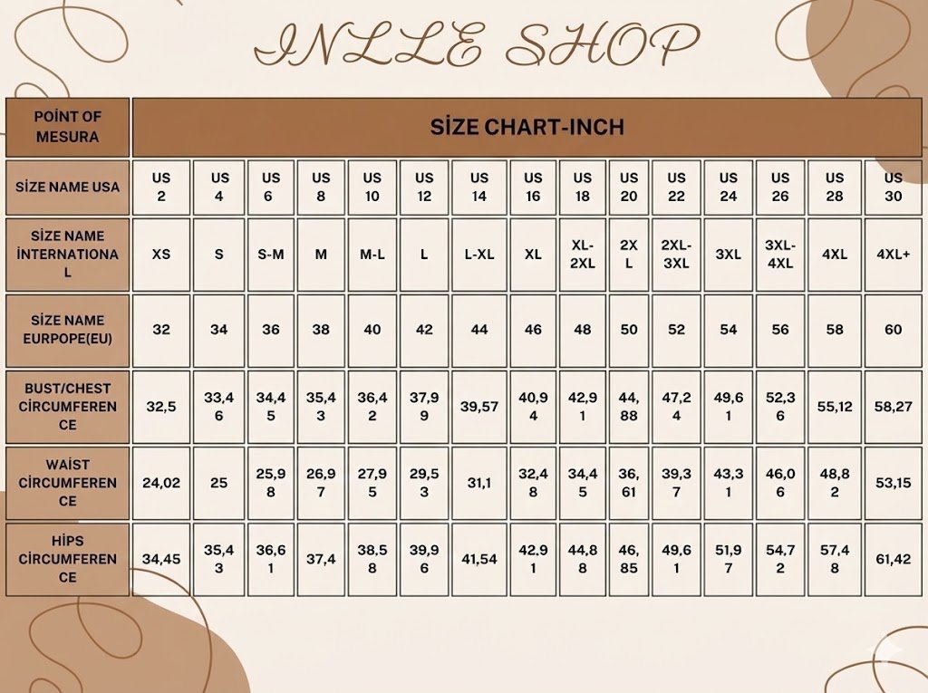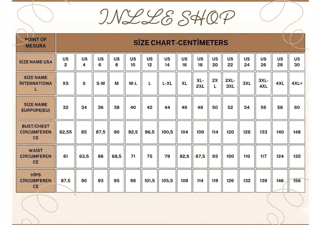 US Sizes: 2, 4, 6, 8, 10, 12, 14, 16, 18, 20, 22, 24, 26, 28, 30