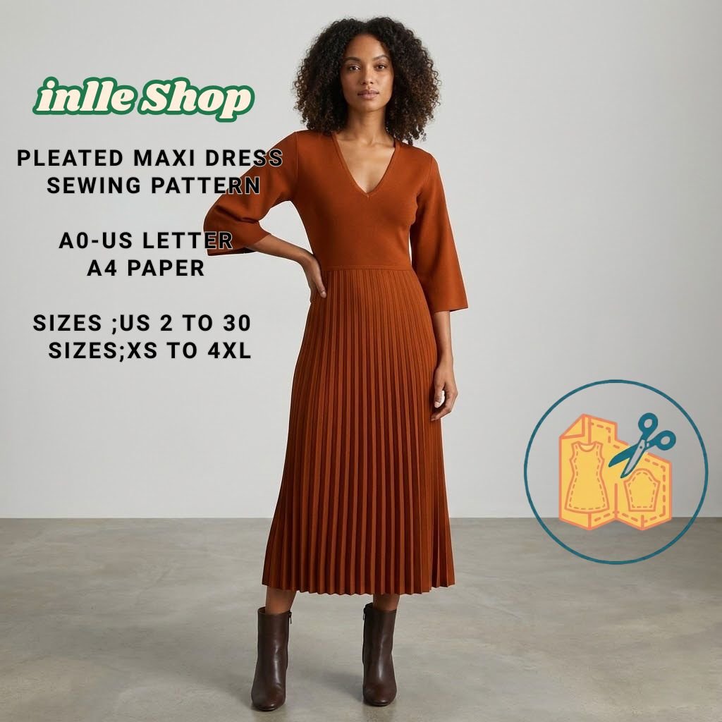 Elegant V Neck Pleated Midi Dress Sewing Pattern available as an instant download (pdf) sewing pattern bundle with a range of size options, including plus sizes ;